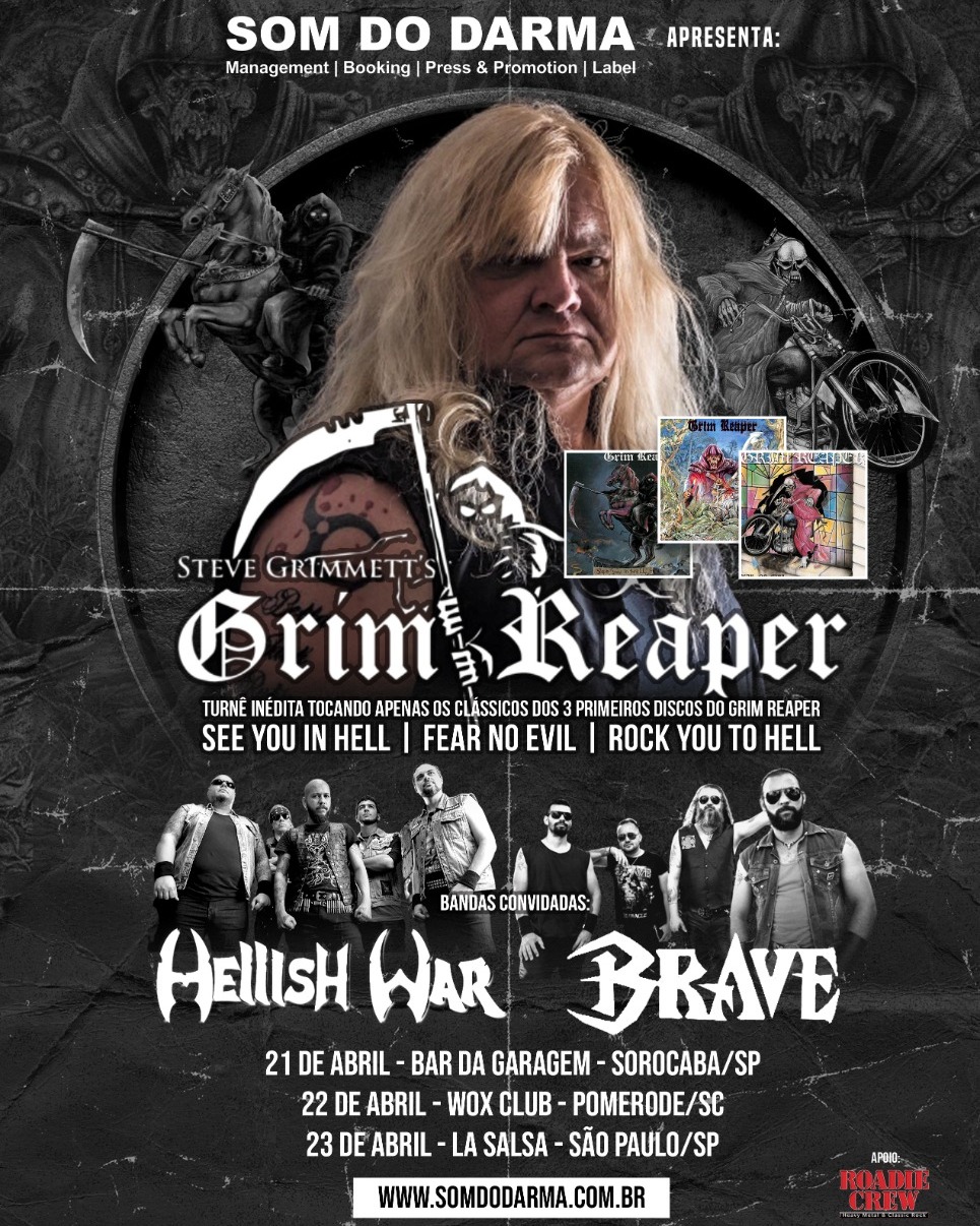 A lenda da New Wave Of Britsh Heavy Metal, o Grim Reaper, esteve no Brasil em Abril. Atualmente liderado pelo seu vocalista e principal líder, Steve Grimmett, por isso mesmo hoje chamada de Steve Grimmett’s Grim Reaper, a banda realizou três novas apresentações no Bar da Garagem em Sorocaba/SP, no Wox Club em Pomerode/SC e no La Salsa em São Paulo/SP.