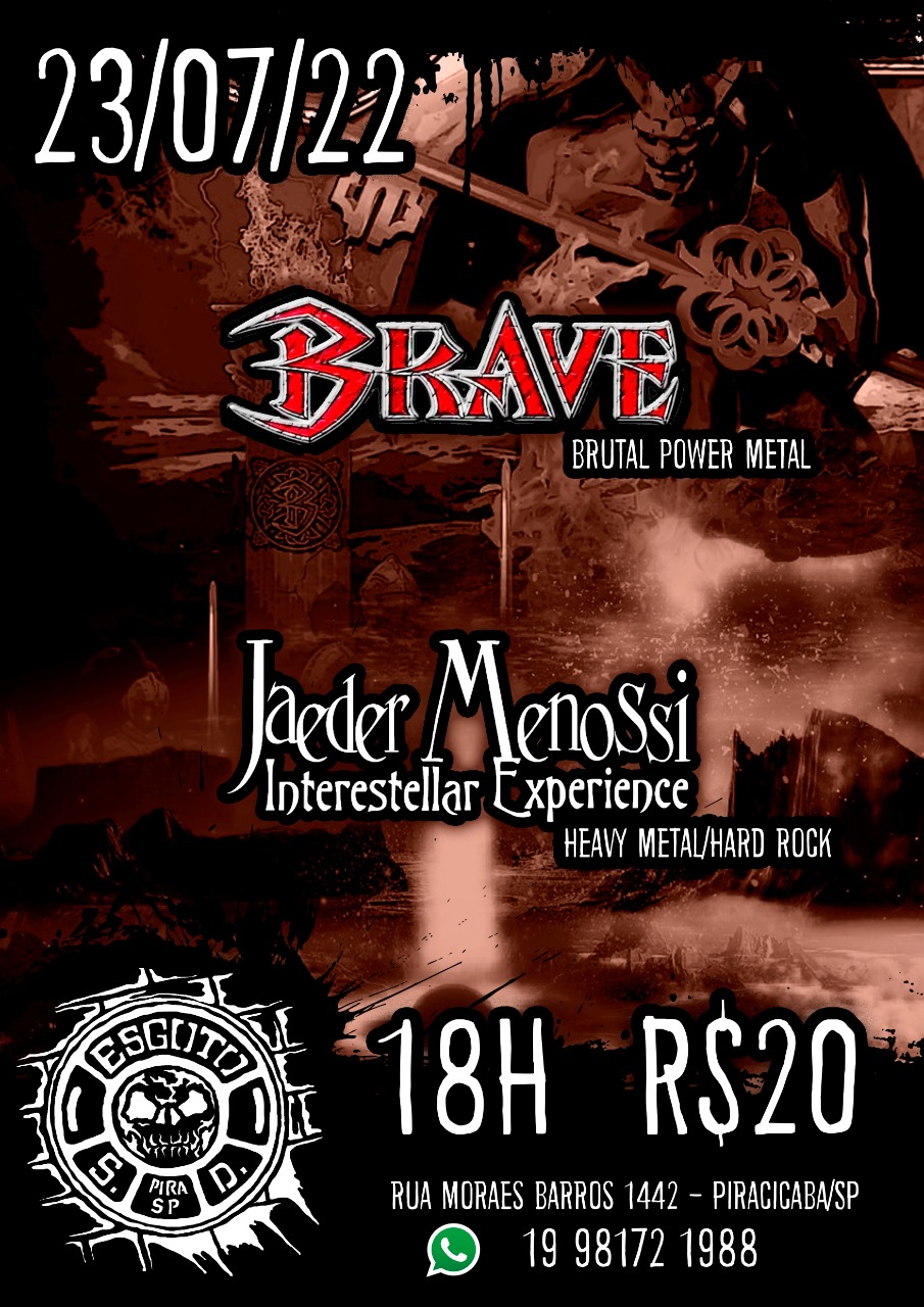 Com apoio da icônica gravadora Heavy Metal Rock, as bandas Brave e Jaeder Menossi Interstellar Experience se apresentam neste sábado, dia 23 de Julho, a partir das 18h, no Esgoto Bar (Rua Moraes Barros, 1442) em Piracicaba/SP. Os ingressos estarão à venda no local por R$ 20,00.