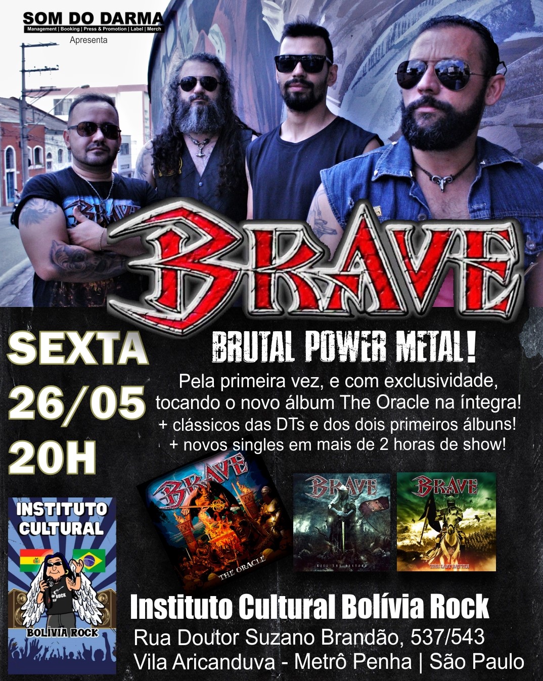 O Brave, que também está confirmado como uma das atrações do renomado Porthell Festival que acontece em Julho em Portel/PA, fará uma apresentação bastante especial nesta sexta-feira, dia 26 de Maio. Pela primeira vez, e com exclusividade, o grupo fará um show com mais de duas horas de duração e que incluirá o álbum “The Oracle” sendo tocado na íntegra. Não obstante, a banda ainda promete tocar os clássicos das primeiras demo tapes e dos dois primeiros álbuns, “The Last Battle” de 2012 e “Kill The Bastard” de 2016, além de seus novos singles.