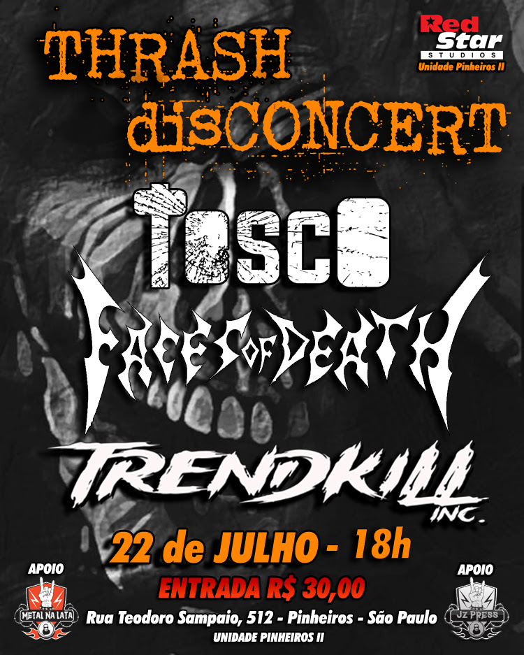 Dia 22 de julho, na RedStar Studios, em São Paulo/SP, você, fã de Heavy Metal, Thrash Metal e Crossover, tem um encontro marcado no Festival THRASH disCONCERT, evento totalmente Old School que trará aos amantes e entusiastas da porradaria o verdadeiro caos em forma de música. As três bandas que deixarão seus corpos moídos por dias são: Trendkill Inc., Faces Of Death e Tosco.