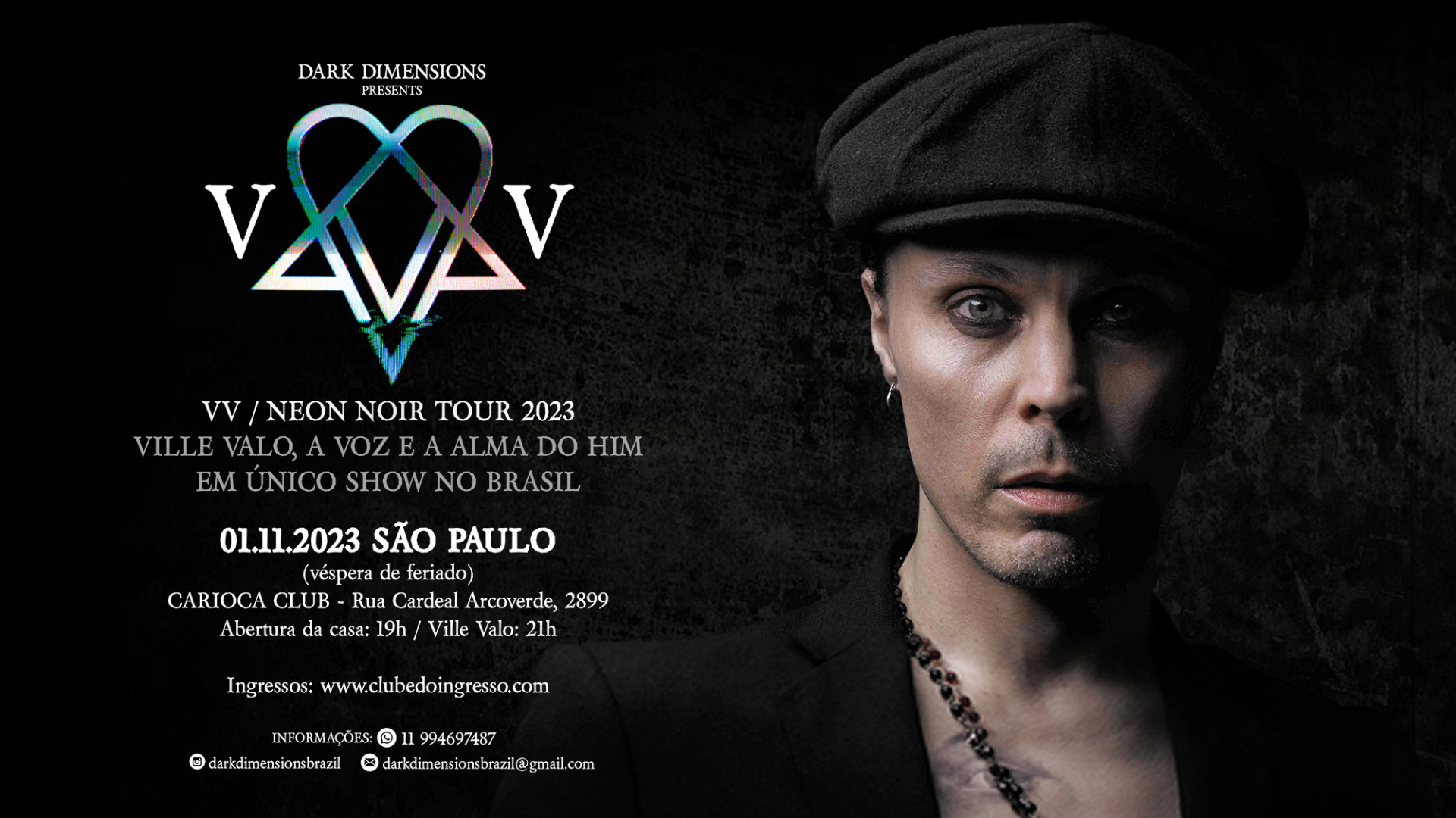 O cantor, compositor e símbolo sexual nascido em Helsinki, na Finlândia, Ville Valo, ex-HIM, vêm ao país em um uma única apresentação dia 1 de novembro, no Carioca Club, em São Paulo, com produção da Dark Dimensions, para promover seu primeiro e mais recente álbum solo “Neon Noir”.