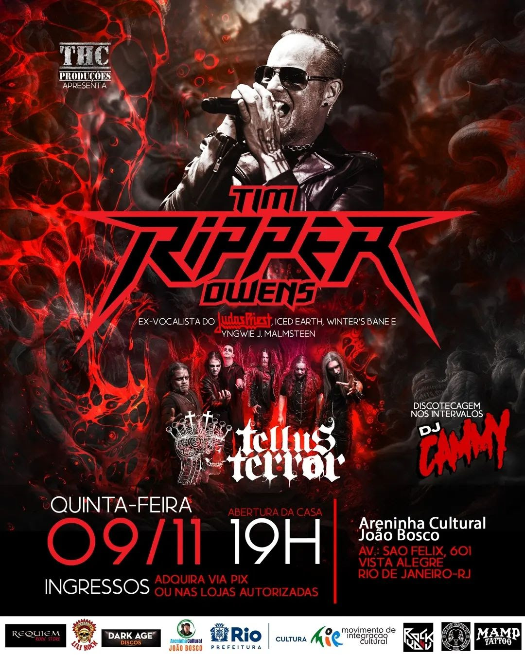 A THC Produções vem trabalhando arduamente em prol da cultura, sempre fazendo o máximo para proporcionar experiências marcantes de qualidade de forma acessível a todos: bandas e público. Por isso, através da Open The Road Agency tem o prazer de anunciar um dos maiores vocalistas de metal de todos os tempos: Tim “Ripper” Owens no Rio de Janeiro. O ex-vocalista do Judas Priest, Iced Earth, Yngwie Malmsteen, e atual KK's Priest (banda de KK Downing, ex-integrante e membro fundador do Judas Priest) fará sua apresentação no dia 09 de Novembro na Areninha Cultural João Bosco (Lona Cultural de Vista Alegre). O setlist contará com 1h40 de apresentação e incluirá muitos clássicos do Judas Priest, incluindo sua fase com os álbuns “Jugulator” e “Demolition”, além claro, de muitos outros clássicos do metal mundial. A banda convidada para abrir essa grande noite será a Tellus Terror, com seu Symphonic Death/Black Metal (fortemente influenciada por Dimmu Borgir), vinda diretamente de Niterói/RJ. Nos intervalos das apresentações, a DJ Cammy Marino (@djcammymarino) não deixará a peteca cair com muito metal para os presentes! SERVIÇO: TIM RIPPER OWENS NO RIO DE JANEIRO Local: Areninha Cultural João Bosco Endereço: Av. São Felix, 601 - Vista Alegre, Rio de Janeiro/RJ Abertura da casa: 19h Banda de abertura: Tellus Terror Produção: THC Produções (thcproducao@gmail.com) Assessoria: JZ Press (jzpress@metalnalata.com.br) Os ingressos já estão disponíveis via PIX (QR Code no flyer) ou de forma física em lojas parceiras autorizadas.