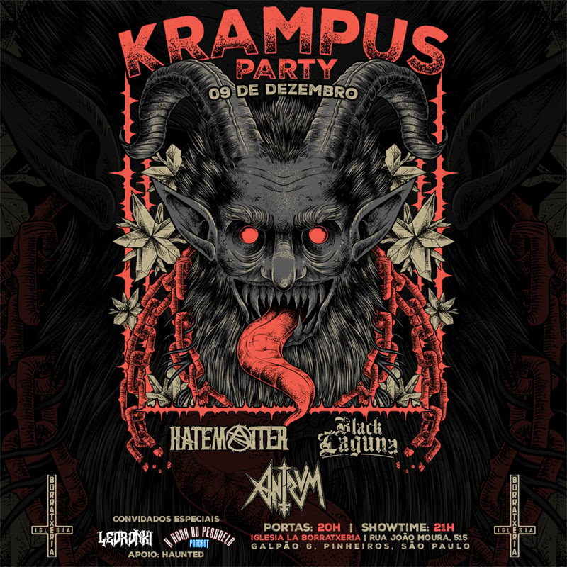 No próximo sábado, dia 9 de dezembro, a partir das 20h, na emblemática casa de shows paulistana La Iglesia Borratxeria, teremos a primeira edição da Krampus Party, uma festa de fim de ano que reunirá numa mesma noite muito metal e entretenimento voltado à cultura do horror. As atrações confirmadas para o evento incluem as bandas Black Laguna, Antrvm, Hatematter - lançando seu novo álbum "Antithesis" -, e a presença do produtor, criador de vídeos e Youtuber Leo Ronki na discotecagem. Além disso, o pessoal do Podcast A Hora do Pesadelo estará presente apresentando seu novo curta-metragem de horror. "Todas as bandas do cast são influenciadas por filmes de horror, então nada melhor do que reunir tudo isso em um evento só. Dessa forma, transformamos o evento de maneira que dialogue com outros públicos do underground", comentou Victor Cutrale, vocal da Antrvm, ex-Furia Inc. idealizador do evento. Os ingressos antecipados já estão à venda pelo Clube do Ingresso. Sobre as bandas: O projeto de metal extremo Antrvm foi formado em 2020 na capital paulista. A banda apresenta, com prioridade e identidade própria, uma fusão de influências contemporâneas que abrangem desde Groove Metal, Thrash Metal até Death Metal. Atualmente, a formação inclui Victor Cutrale (vocal, ex-Furia Inc), Yohan Kisser (Sioux 66) e Victor Henrique nas guitarras, Bruno Nicolozzi (Worst, baixo) e Matt Carrilho (Kryour, bateria). Com essa configuração, a banda está focada em apresentar seu repertório centrado no lançamento do primeiro EP da carreira, intitulado "Defiler", que se destaca pela excelente inspiração na temática de filmes de horror. A proeminente banda paulistana de Melodic Death/Groove Metal Hatematter, formada em 2007, lançou recentemente "Antithesis", o quarto álbum de sua carreira. Mais uma vez, a banda transcende as fronteiras do metal, amalgamando influências diversas em um conjunto coeso e emocionalmente impactante. "Antithesis" é um álbum forjado no metal pesado contemporâneo que explora temas de reconstrução, camaradagem, amor e aceitação, inspirados em filmes cult de ficção científica e horror. Composta atualmente por Luiz Artur (vocal), André Martins (baixo), André Buck (guitarra), Thiago M. Ribeiro (guitarra/vocal), Rafael Augusto Lopes (sintetizadores e orquestrações) e André Kim (bateria), a Hatematter fará nesse evento o show lançamento de seu novo trabalho. A banda Black Laguna, formada em 2012 por Ryan Lopez e Fabrício Pereira, tem como proposta o Groove Metal em português. Após a boa recepção do single "O Velho Beberrão", lançaram o EP homônimo em 2013, seguido por apresentações enérgicas pelo estado de São Paulo, ganhando a alcunha carinhosa de "Metal Cerveja". Em 2016, o single "A Besta" marcou uma nova fase com a apresentação da formação que vinha sendo moldada desde 2015. Contudo, em 2017, a banda entrou em hiato indefinido. A tragédia chegou em fevereiro de 2023 com a morte de Fabrício Pereira, levando a banda a planejar seu último show para encerrar sua jornada justamente no show da Krampus Party. Com a formação contando com Ryan Lopez (vocal), Paulo Hipolito (baixo), Ricardo Bancalero e Luan Vieira (guitarras), e Guilherme Estrada (bateria), o grupo promete não apenas colocar um ponto final na carreira, mas uma celebração ao amigo que infelizmente se foi e à influência marcante do Black Laguna no metal brasileiro. SERVIÇO: Krampus Party Data: 9 de dezembro (sábado) Local: La Iglesia Borratxeria Endereço: Rua João Moura, 515 - Galpão 6, Pinheiros - São Paulo/SP Bandas: Black Laguna, Antrvm e Hatematter Convidados especiais: Podcast A Hora do Pesadelo (Horror/Cinema) Discotecagem: Leo Ronki Abertura das portas: 20h Início dos shows: 21h Ingressos à R$ 40 Antecipado via Clube do Ingresso em: https://www.clubedoingresso.com/evento/krampusparty-1ed-laiglesiaborratxeria Apoio: Haunted Brewing Créditos: Foto Black Laguna por Renk Vondevah Foto Antrvm por Léo Xavier Foto Hatematter por Maíra Nakahara Links Relacionados: https://www.instagram.com/hatematter https://www.instagram.com/antrvm.official https://www.instagram.com/blacklagunaoficial https://www.instagram.com/iglesia_borratxeria https://www.instagram.com/leoronki https://www.instagram.com/hauntedbrewing https://www.instagram.com/ahoradopesadelopodcast |
