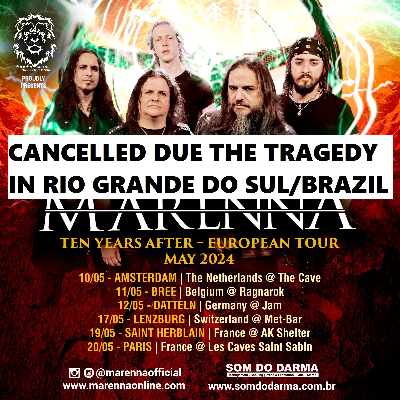 Dez anos depois de sua formação, eis que o Marenna faria sua primeira turnê europeia. A "Ten Years After Tour" aconteceria de 07 a 21 de Maio e contaria com seis shows em cinco países diferentes - Holanda, Bélgica, Alemanha, Suíça e França -, mas teve que ser cancelada por conta da tragédia que assola o estado do Rio Grande do Sul. Com dois integrantes vivendo em Caxias do Sul e três em Porto Alegre, a banda encontra-se isolada no estado, sem alternativas, seja por via aérea ou terrestre, de pegar seu voo para Amsterdam que sairia amanhã, terça-feira, dia 07 de Maio, do aeroporto internacional de Guarulhos na grande São Paulo.