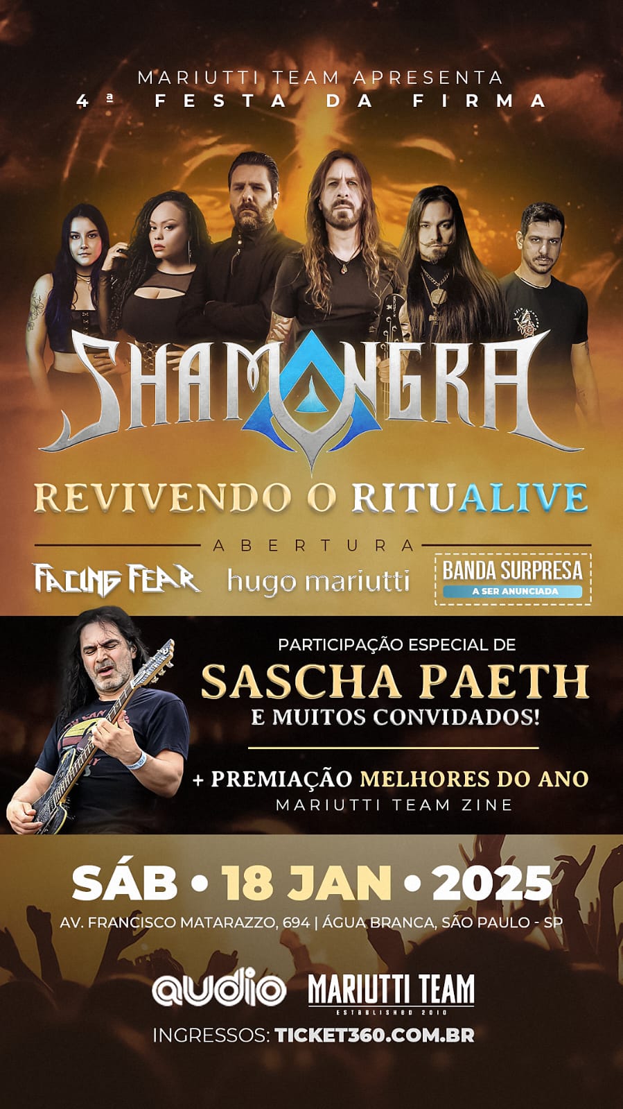 O renomado baixista Luis Mariutti, através do Mariutti Team, anunciou a 4ª edição de sua já tradicional Festa da Firma para o dia 18 de Janeiro de 2025, na Audio, em São Paulo-SP, celebrando o legado de um dos álbuns mais importantes do Metal Nacional, o "RituAlive", do Shaman.
