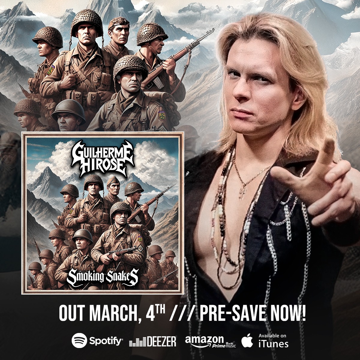 A música “Smoking Snakes” retrata a história real de três soldados brasileiros que, durante a Segunda Guerra Mundial, enfrentaram condições extremas no front italiano. Conhecidos como “Cobras Fumantes”, esses heróis integraram a Força Expedicionária Brasileira (FEB) e se destacaram por sua coragem, resiliência e determinação em resistir até o fim, mesmo diante de cenários desoladores. A canção é um tributo à bravura desses soldados, que conquistaram o respeito até mesmo de seus inimigos, e à contribuição do Brasil para a luta pela liberdade durante o conflito.