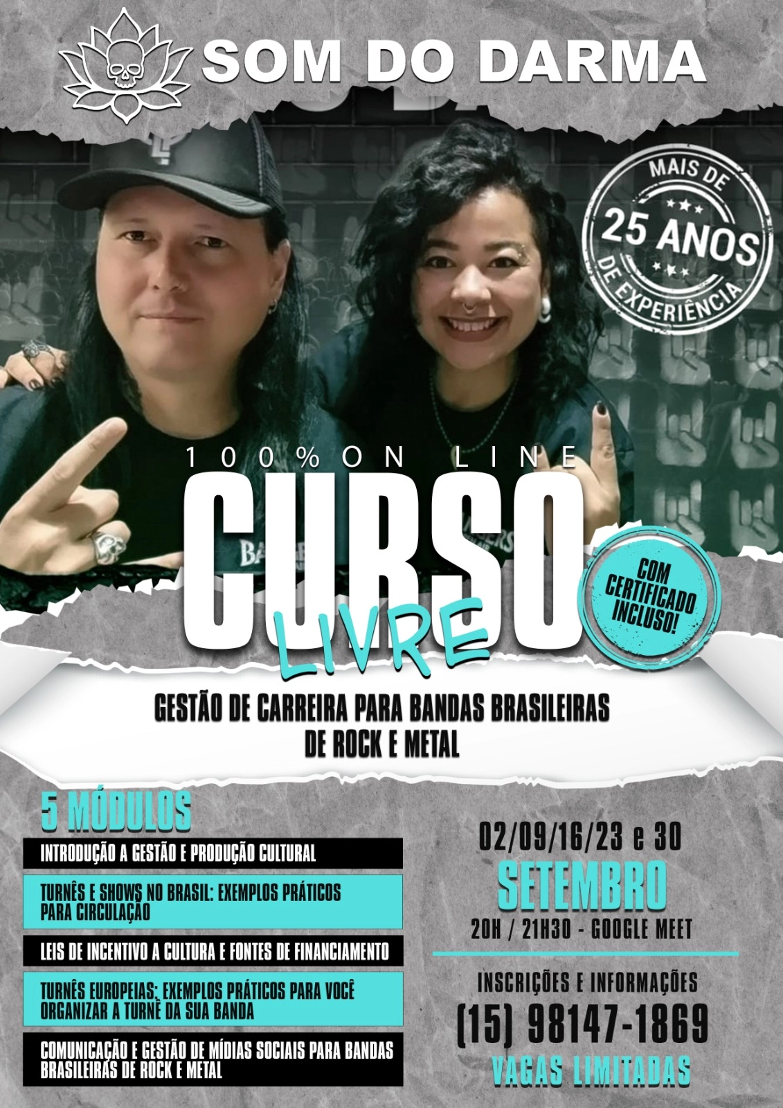 O curso livre de Gestão de Carreira para bandas brasileiras de rock e metal promovido pela Som do Darma já está com as inscrições abertas vai oferecer certificado de participação. Inscrições ou mais informações podem ser obtidas através do Whats App: (15) 98147-1869 com Susi Bomb.